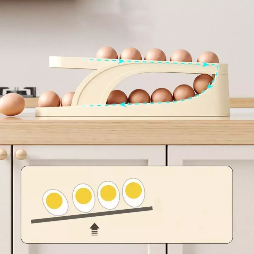 2. Os ovos inclinados são dispensados um de cada vez. Retire os ovos e os seguintes rolaram automaticamente.