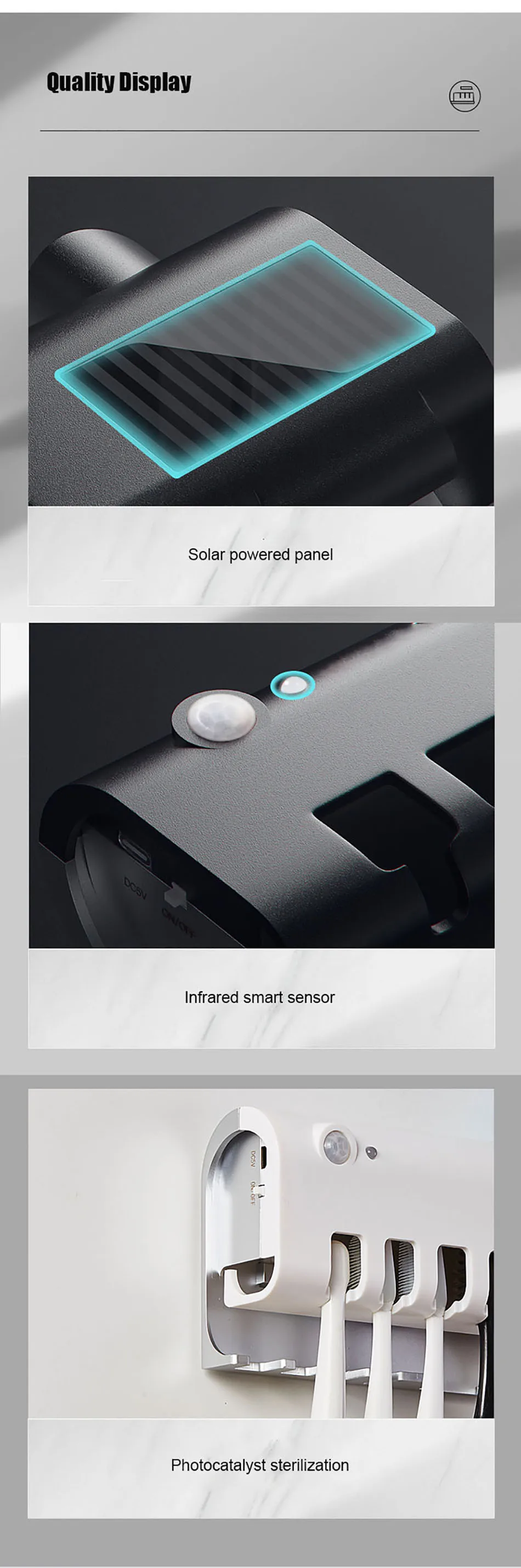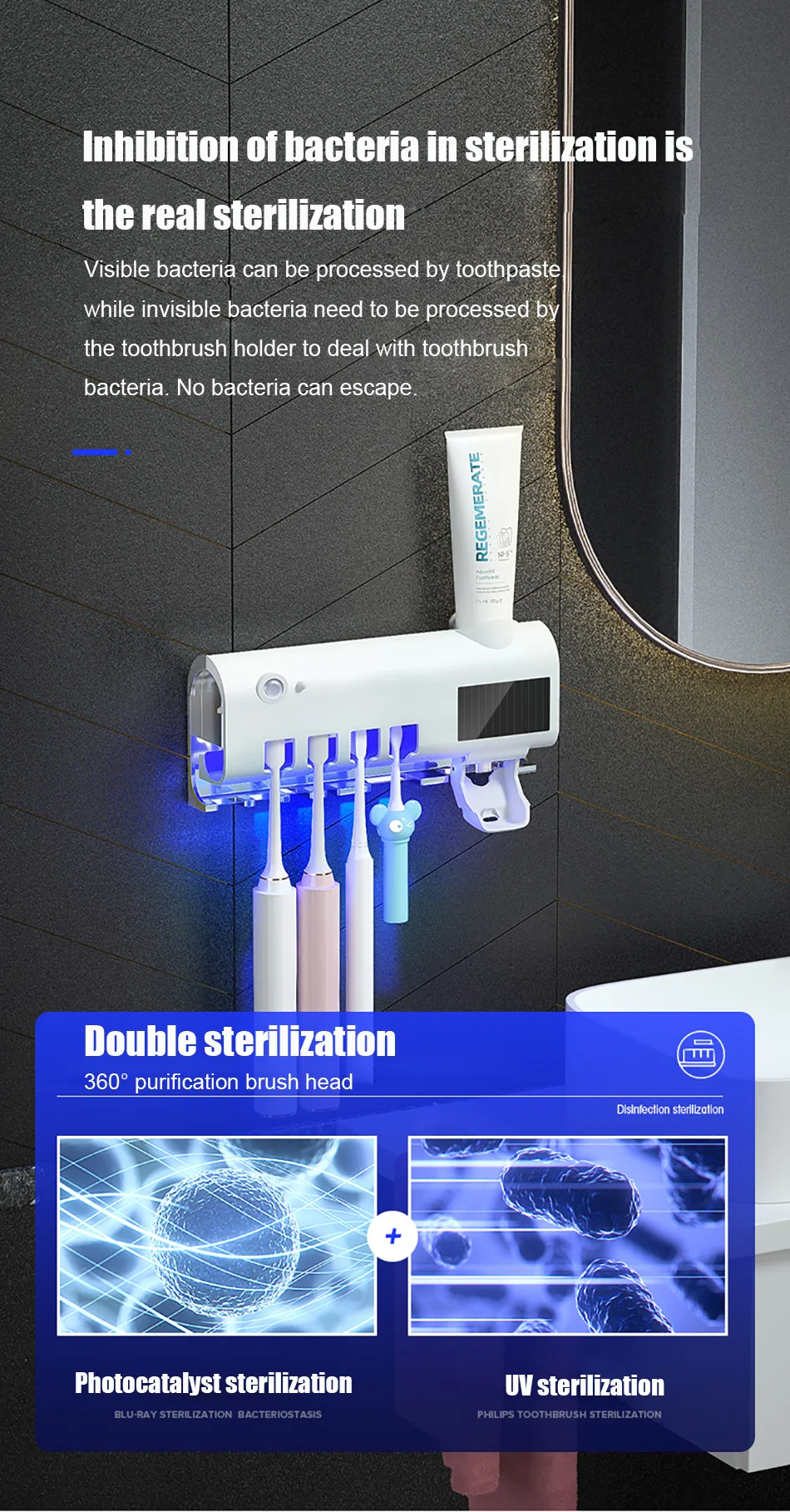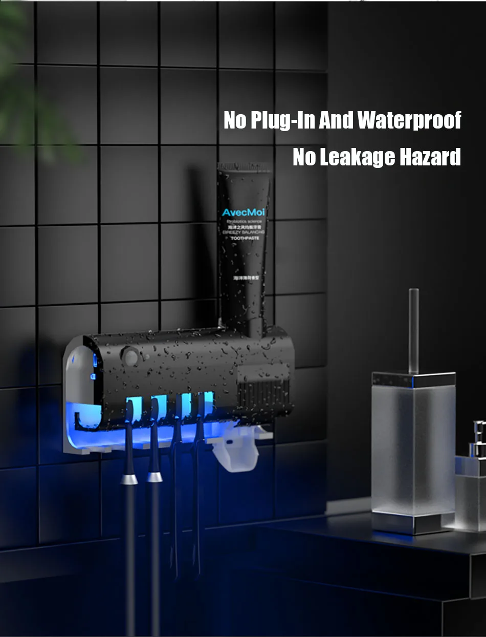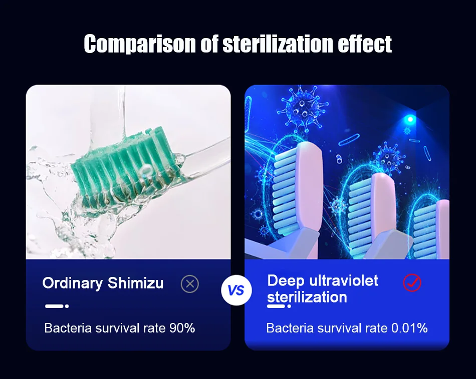 1.Esterilizador de escova de dentes ultravioleta, fotocatalisador + esterilização ultravioleta, taxa de esterilização chega a 99,9%, a desinfecção da escova de dentes é mais completa