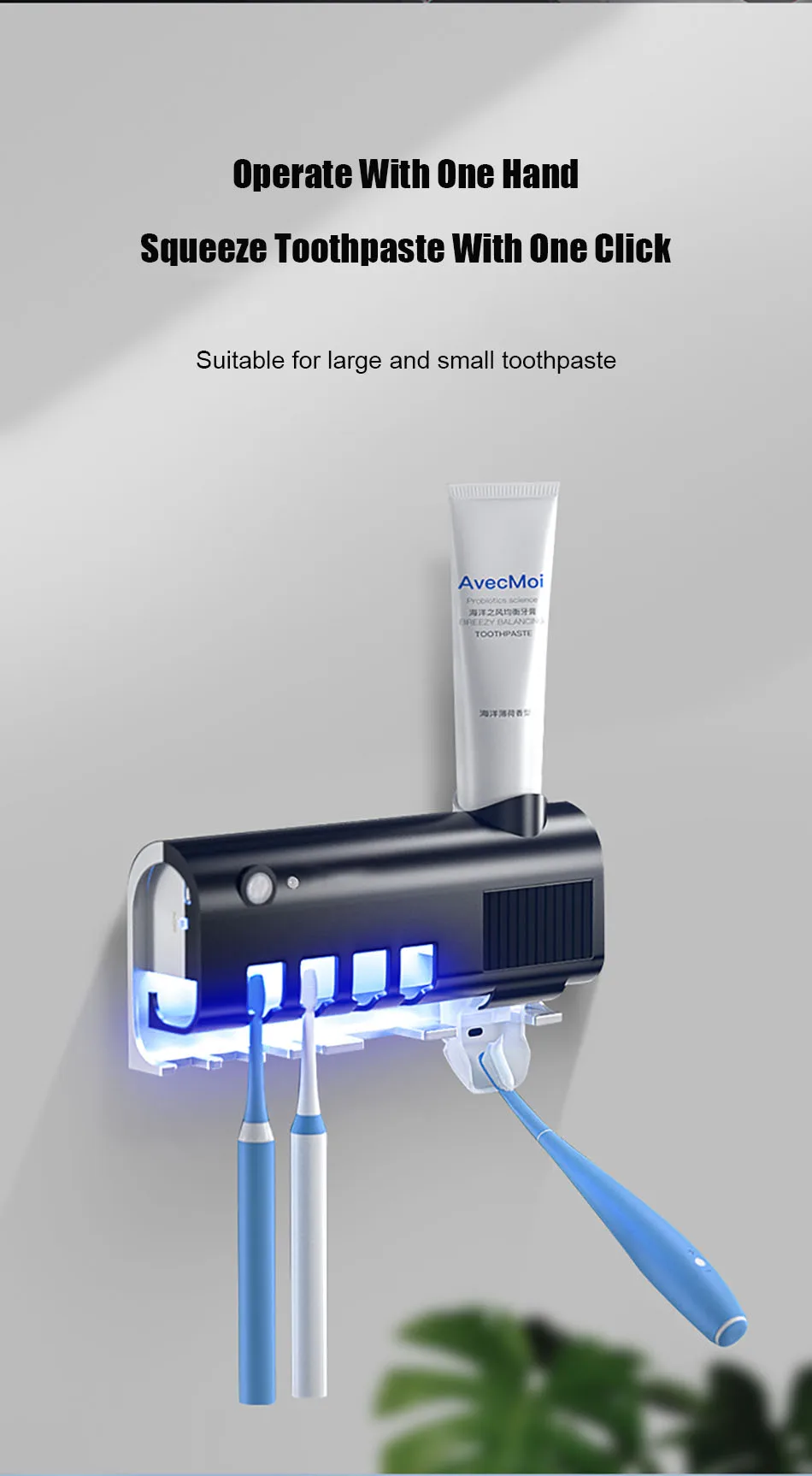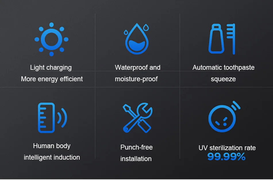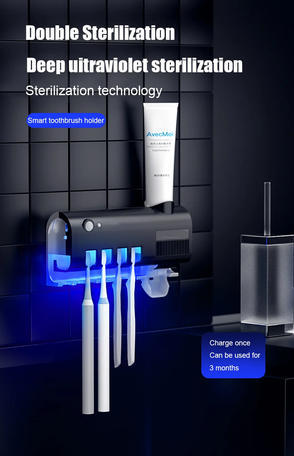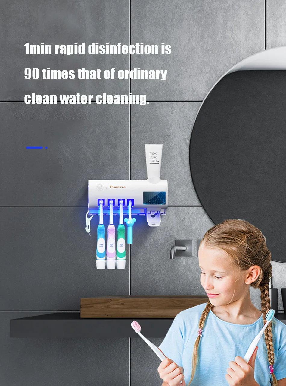 1.Esterilizador de escova de dentes ultravioleta, fotocatalisador + esterilização ultravioleta, taxa de esterilização chega a 99,9%, a desinfecção da escova de dentes é mais completa