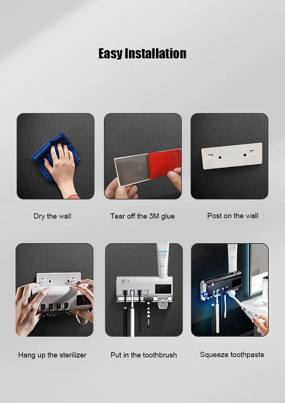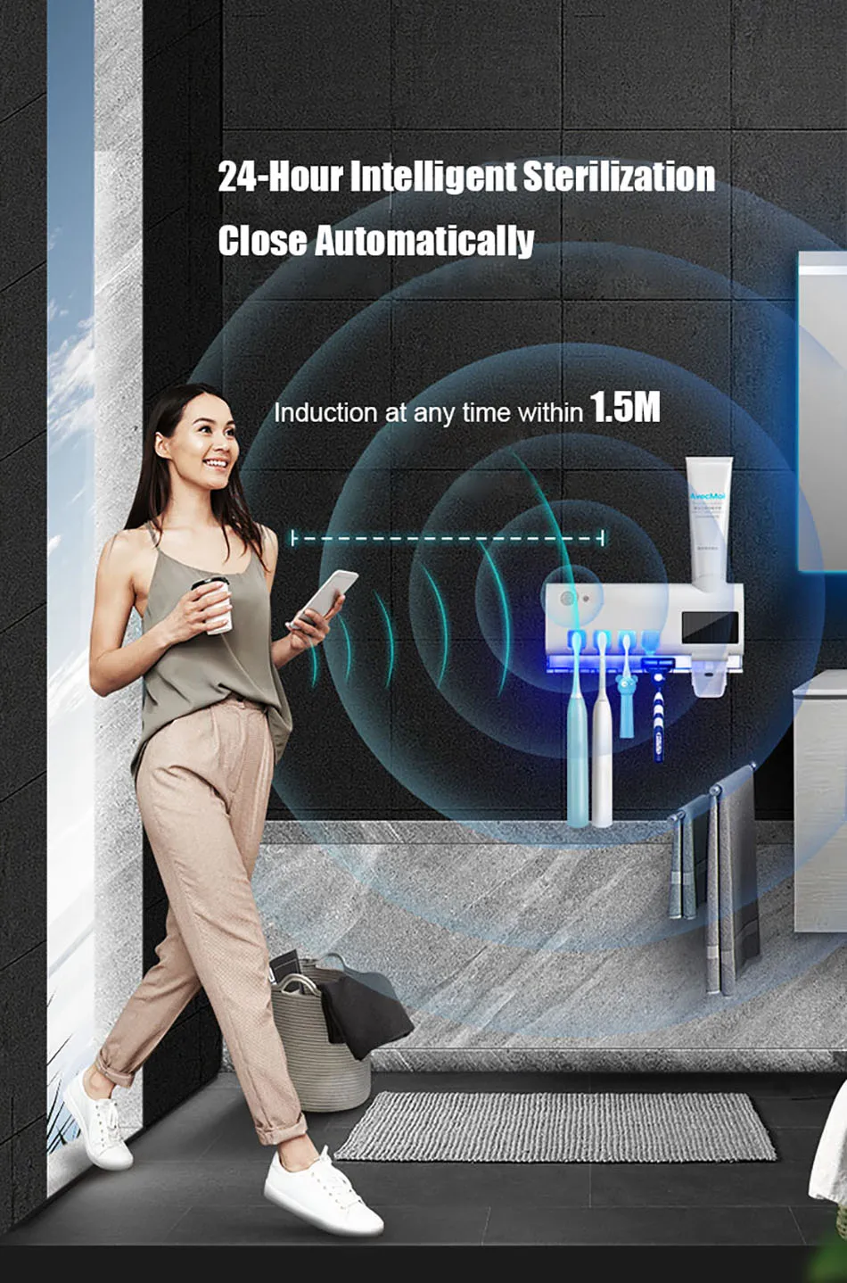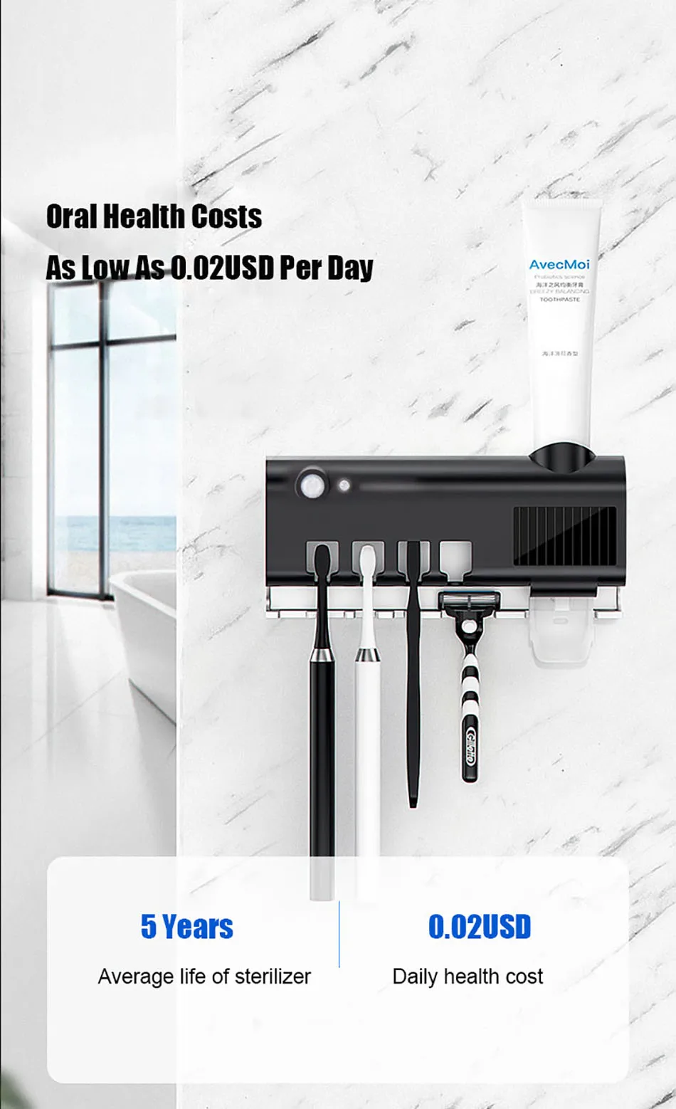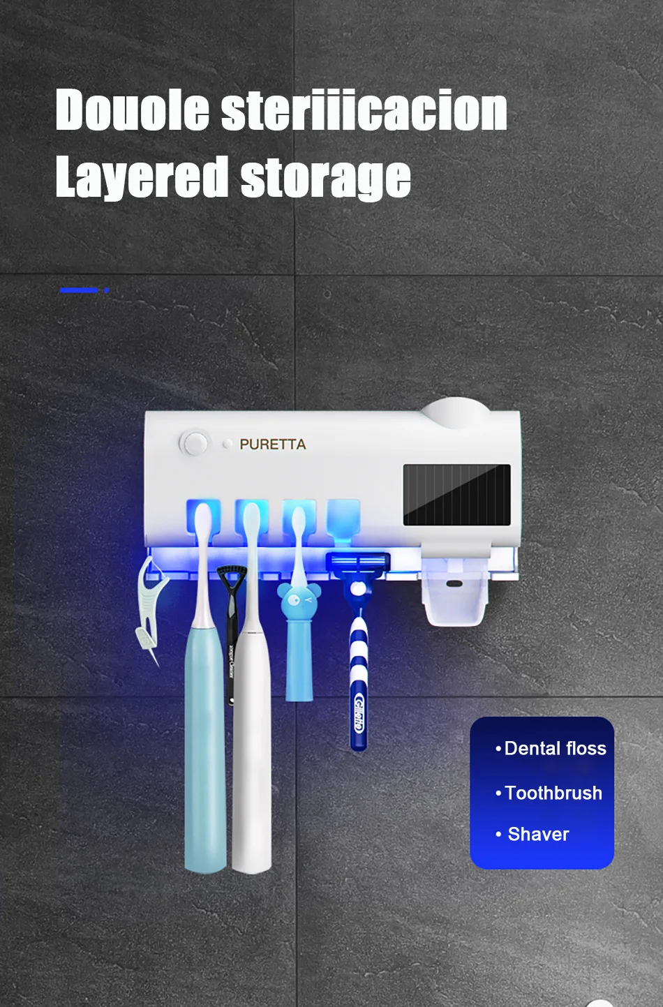 1.Esterilizador de escova de dentes ultravioleta, fotocatalisador + esterilização ultravioleta, taxa de esterilização chega a 99,9%, a desinfecção da escova de dentes é mais completa