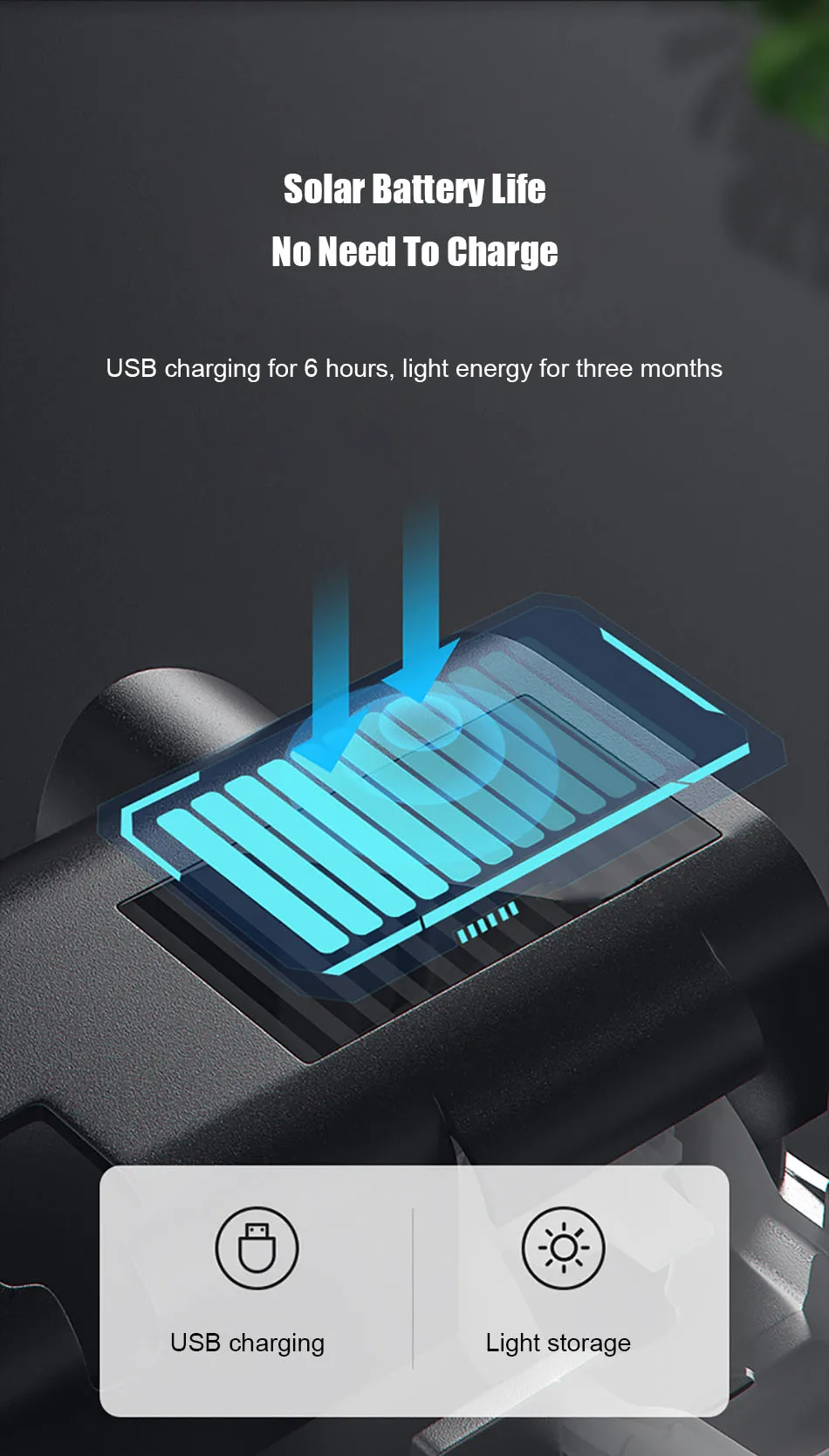 4.Design de armazenamento de energia solar, após carregamento USB, a placa de fonte de energia solar pode estender o armazenamento de eletricidade sem carregamento contínuo, o que é conveniente para economizar energia